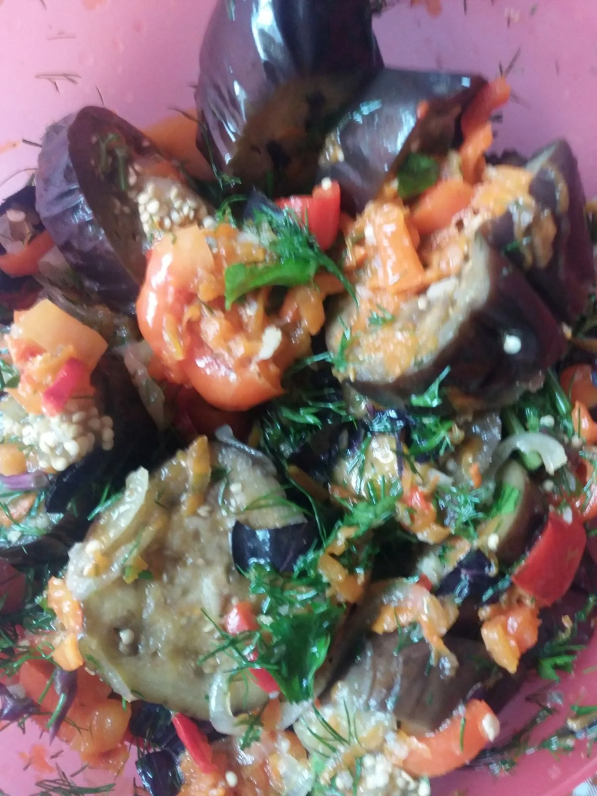 ШАГ 4 Сложить остывшие баклажаны и пропассерованные овощи в глубокую посуду. Смешать уксус, сахар и соль, размешать и вылить в овощи, добавить оставшееся растительное масло.