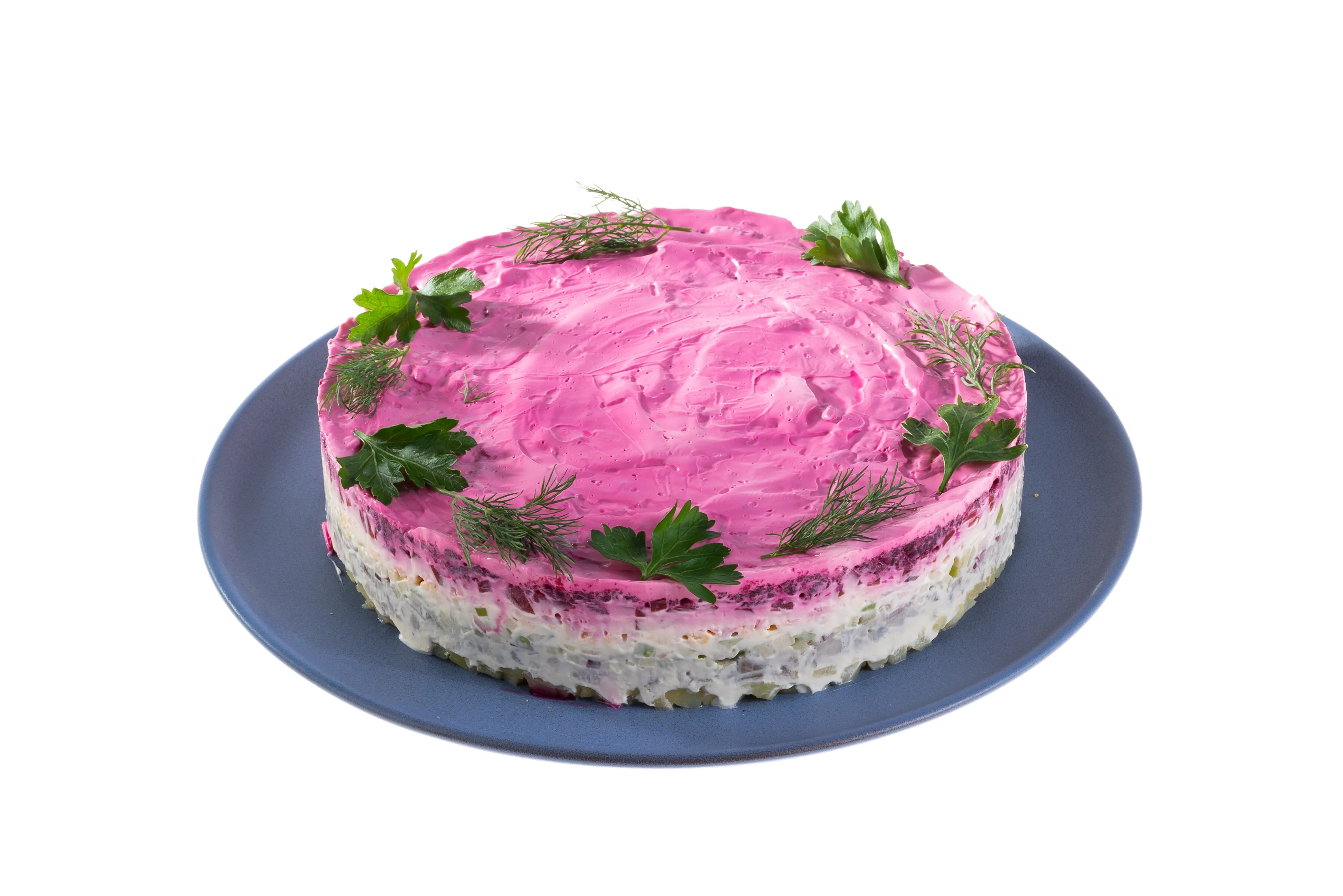 ШАГ 4 Выложить салат на блюдо слоями, промазывая каждый майонезом. Вот рекомендуемый порядок продуктов: картошка, селедка, лук, яблоки, яйца, морковь, свекла. Завершающий слой свеклы также смазать майонезом. Готовый салат отправить в холодильник на пару-тройку часов, чтобы дать ему пропитаться. Перед подачей украсить салат зеленью.