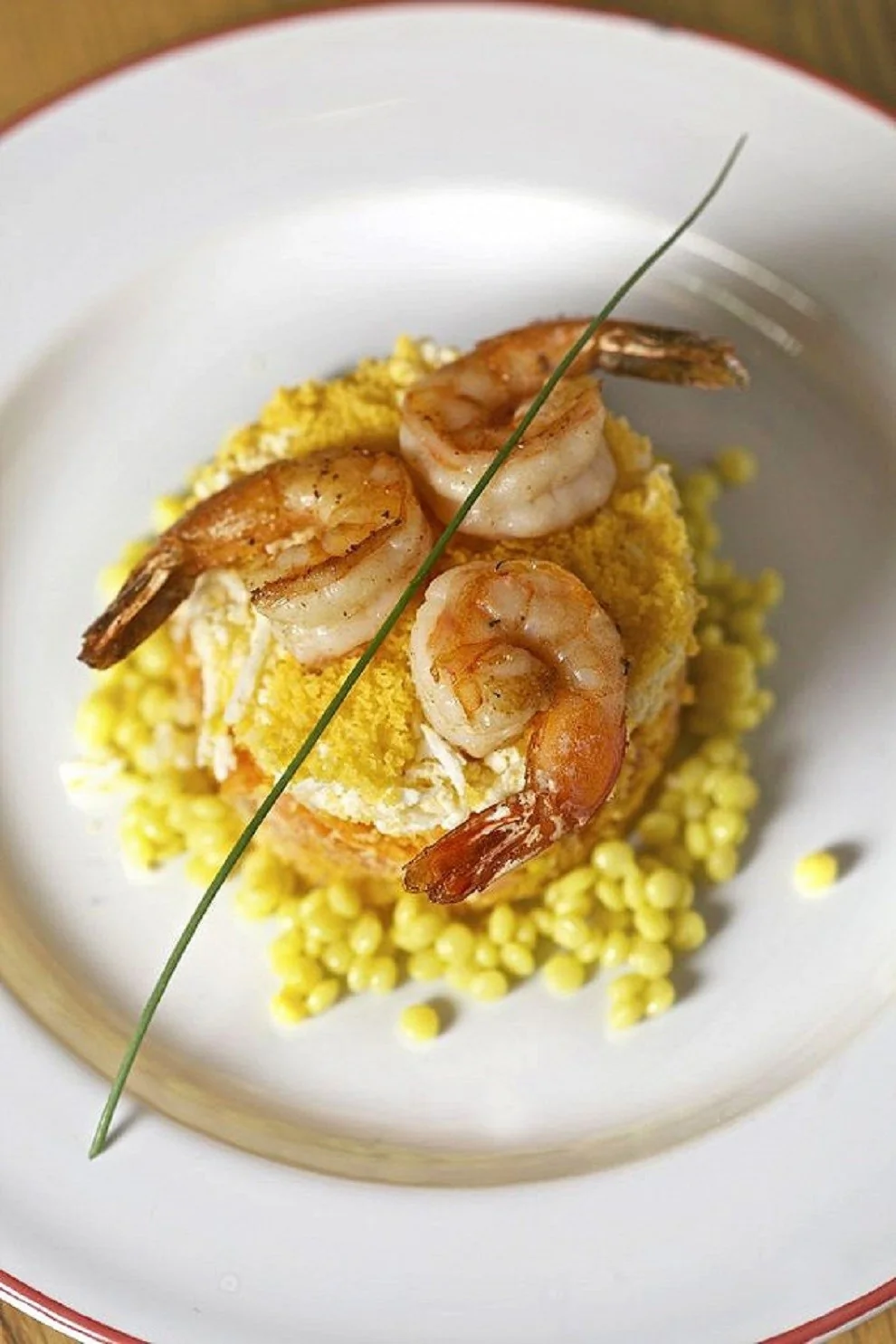 ШАГ 8 Аккуратно снять с салата кольцо, украсить обжаренными креветками и подавать.