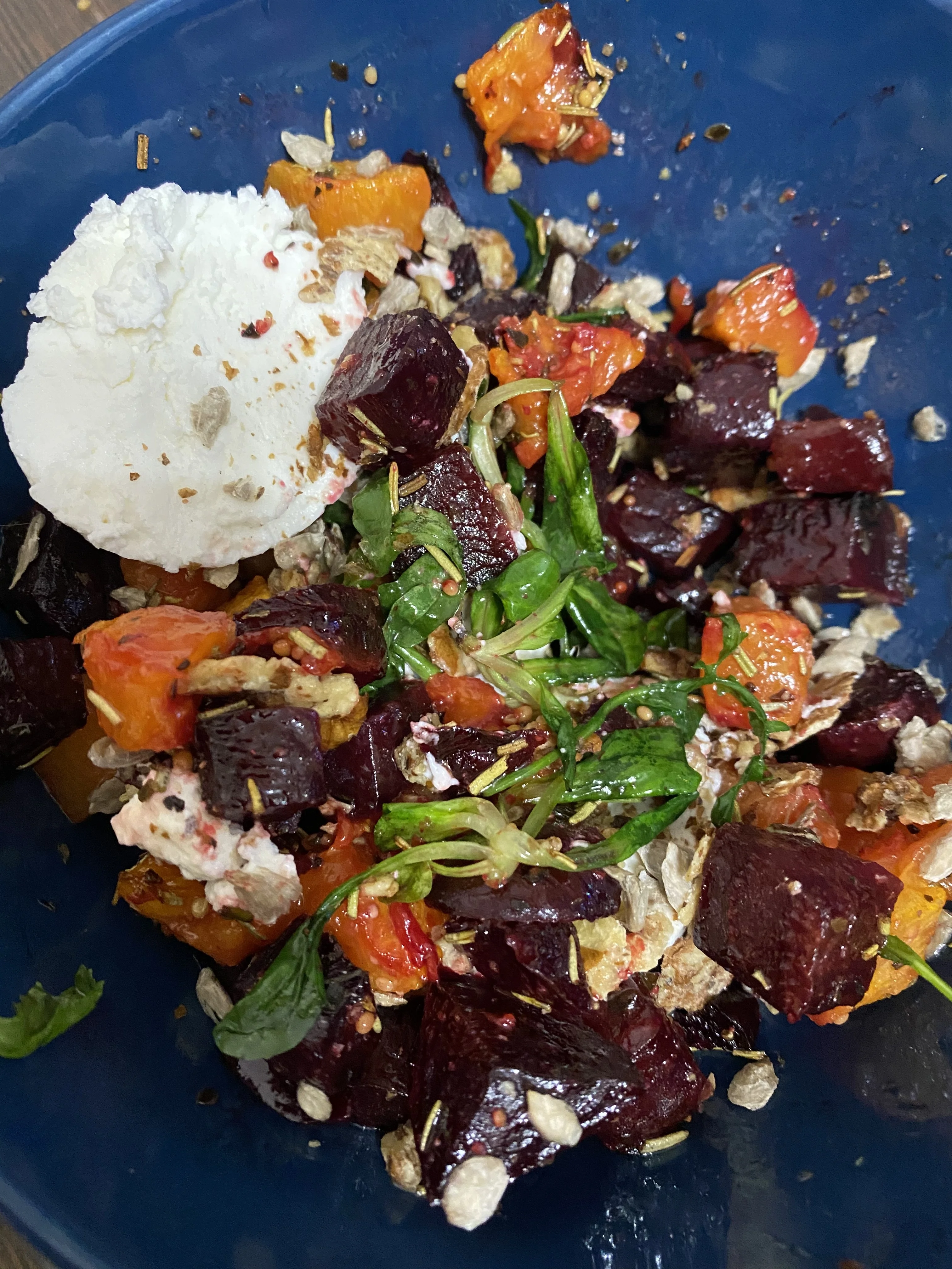 ШАГ 4 В чашу выложить руколу, готовые овощи, добавить козий сыр, орехи и посыпать семечками.
