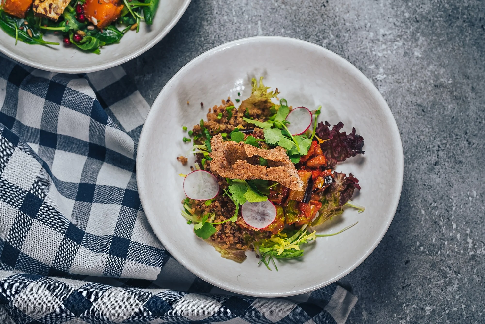 ШАГ 7 Для подачи выложить на тарелку микс-салат, заправить его оливковым маслом. Рядом выложить овощи с томатным соусом. Посыпать киноа и оставшейся рубленой кинзой. Украсить тонко нарезанным редисом. В конце сбрызнуть оливковым маслом и подавать.