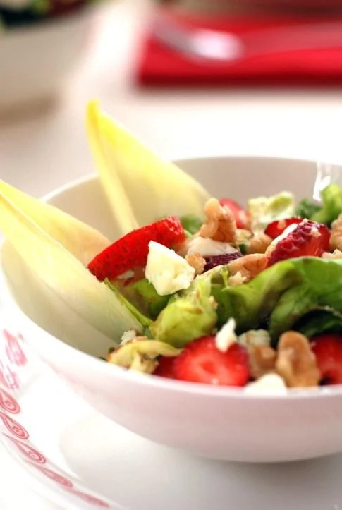 Зеленый салат с клубникой, фетой и грецкими орехами