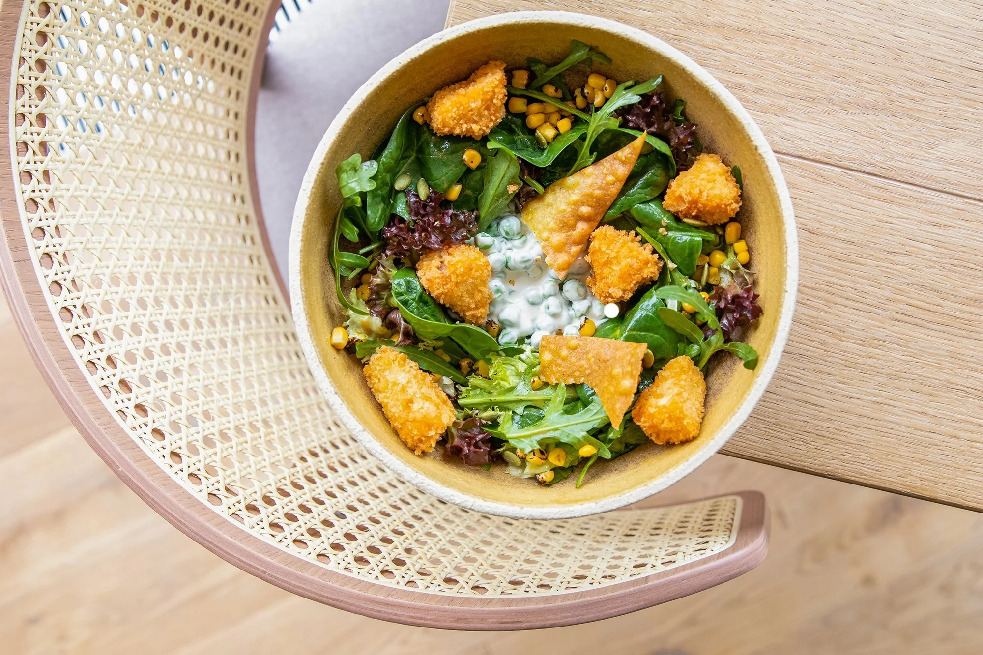 ШАГ 4 Слегка обжечь уже отварную кукурузу горелкой. Заправить микс-салат оливковым маслом и каплей соевого соуса.