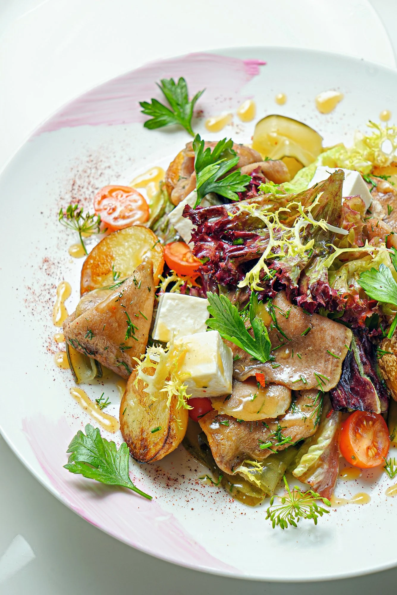 ШАГ 5 Горячие слайсы языка выложить на готовый салат и сразу подать.