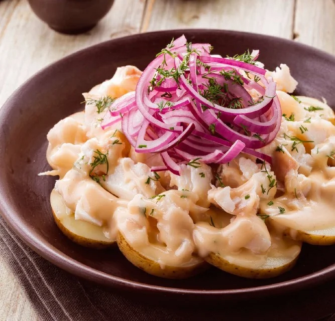 картофель и лук. Затем поверх уложить рыбу и полить ее эмульсией.
