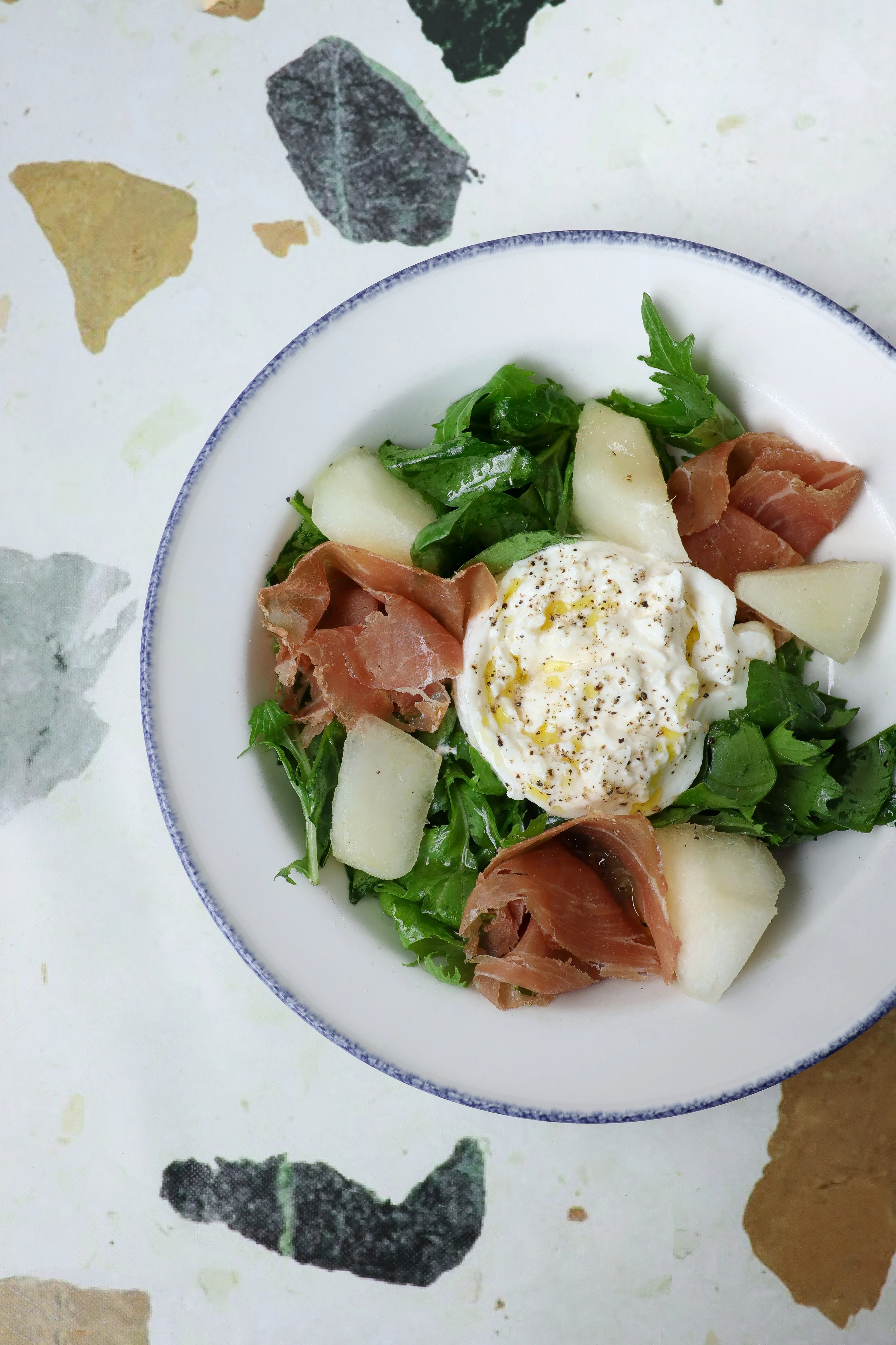 Ингредиенты для приготовления Салат с бурратой, дыней и прошутто: