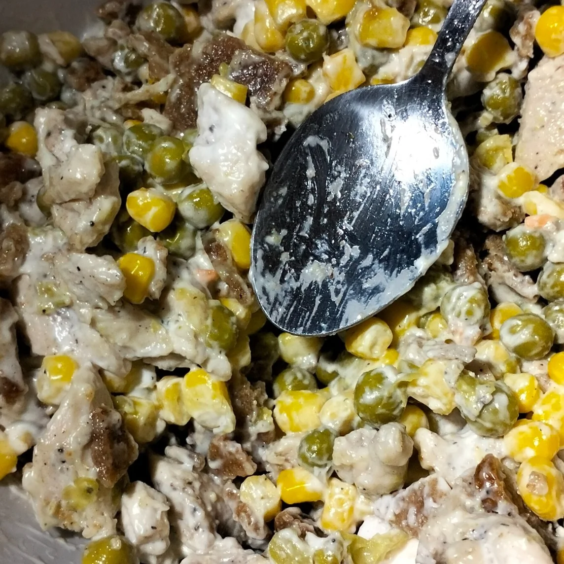 Филе куриной грудки Консервированная кукуруза Консервированный зеленый горошек Сухарики Молотый черный перец Майонез Подсолнечное масло Соль Главная Салаты Русская кухня