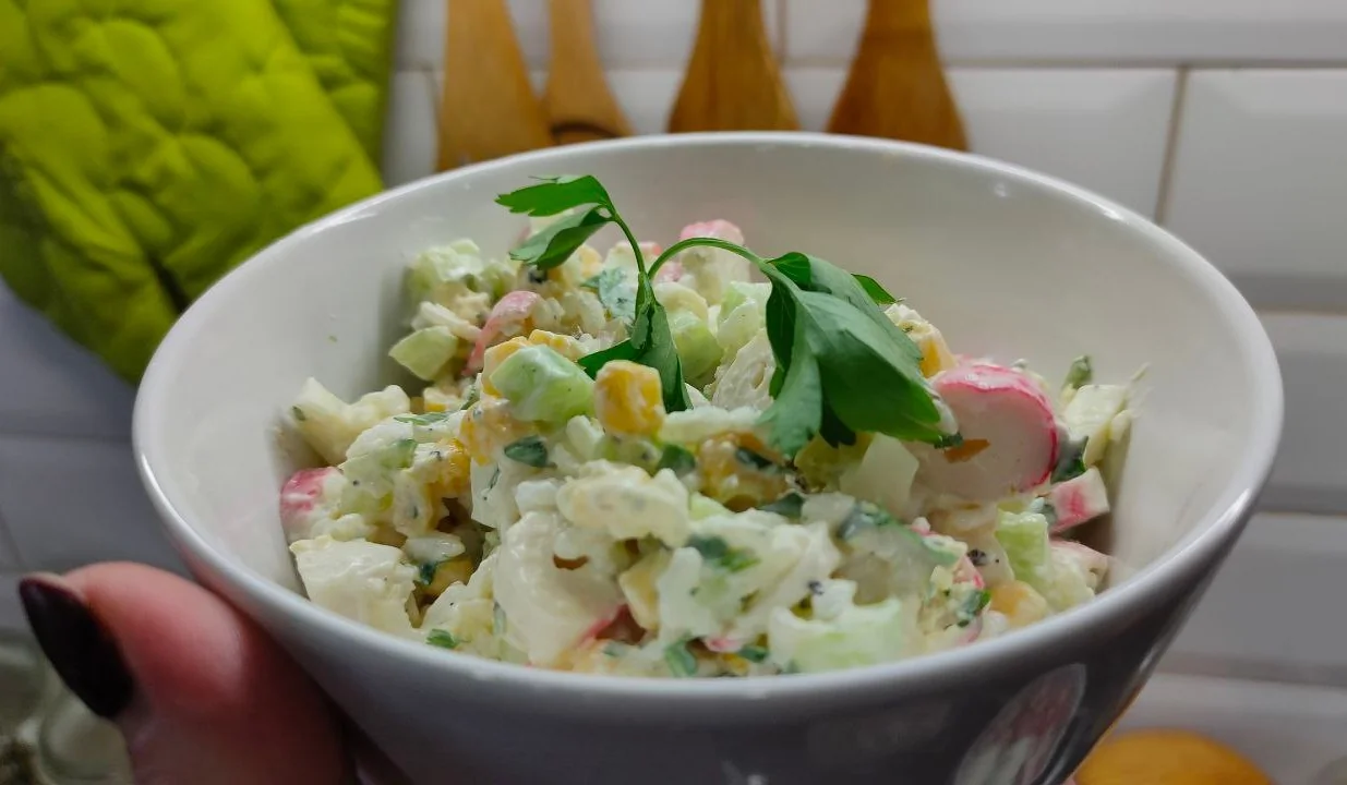 Салат с крабовыми палочками, рисом и кукурузой