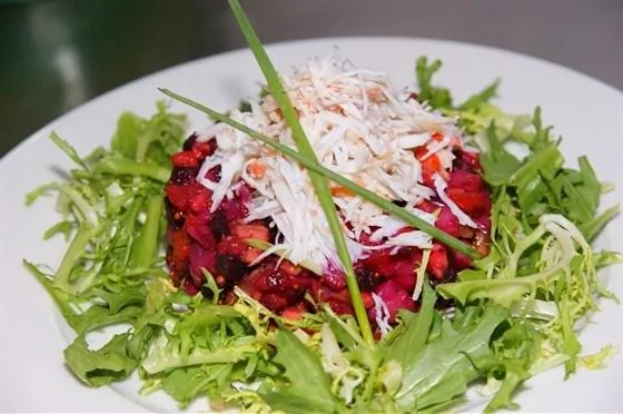 ШАГ 3 Набор овощей для винегрета смешать с подготовленными ингредиентами, заправить по вкусу соусом и выложить на блюдо. Сверху украсить кусочками краба.