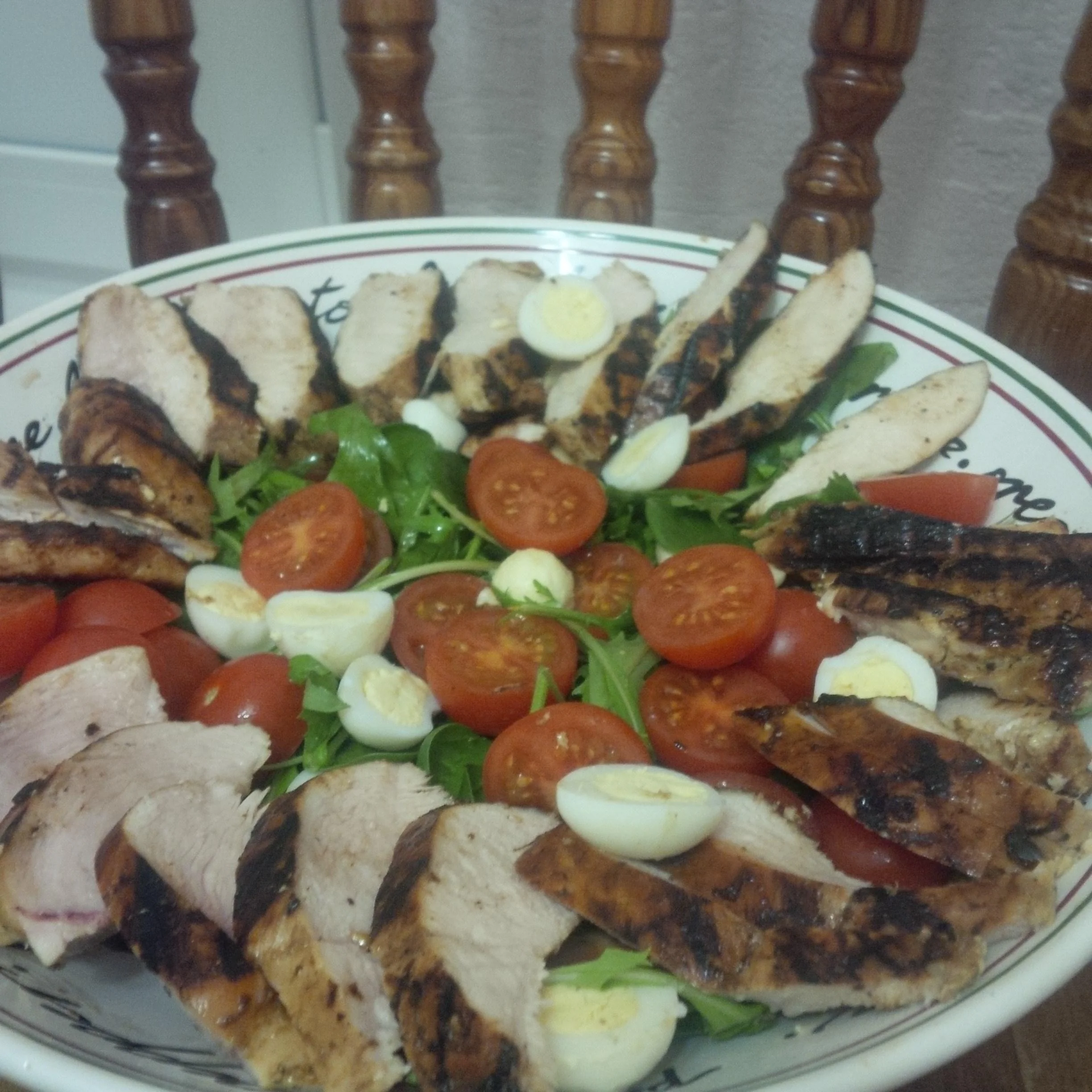 ШАГ 4 Порезать или порвать вареное филе на небольшие кусочки, порезать яйца на 4 части, порезать помидор кубиками в 1 см, выложить в тарелку (порционно), слегка перемешать.