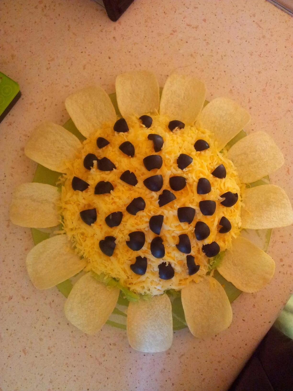 ШАГ 5 Перед подачей на стол салат украшаем по краям чипсами, а в центре посыпаем измельченным ядром семян подсолнечника.