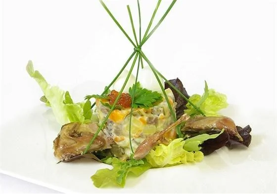 ШАГ 2 Добавить каперсов и оливок и залить соусом провансаль, с добавлением соуса кабуль. Остудив, переложить в хрустальную вазу, украсить раковыми шейками, листиками салата-латука и рубленным ланспиком. Подавать очень холодным.