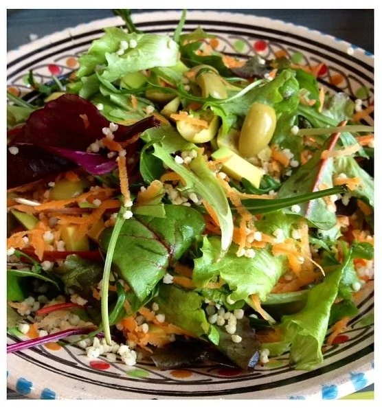 ШАГ 2 Морковь потереть на крупной терке. Оливки отделить от косточек и разрезать на четвертинки. Авокадо нарезать кубиками. Добавить руколу.
