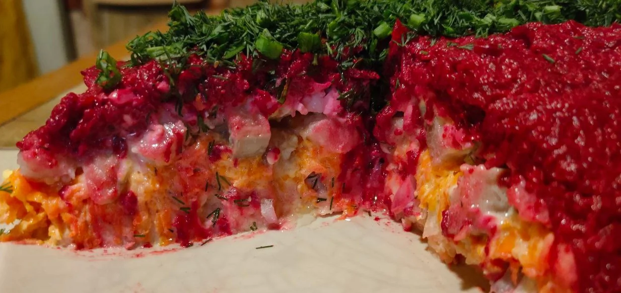 ШАГ 20 Самым последним слоем выложить свеклу с майонезом, равномерно распределить по поверхности и бокам горки.