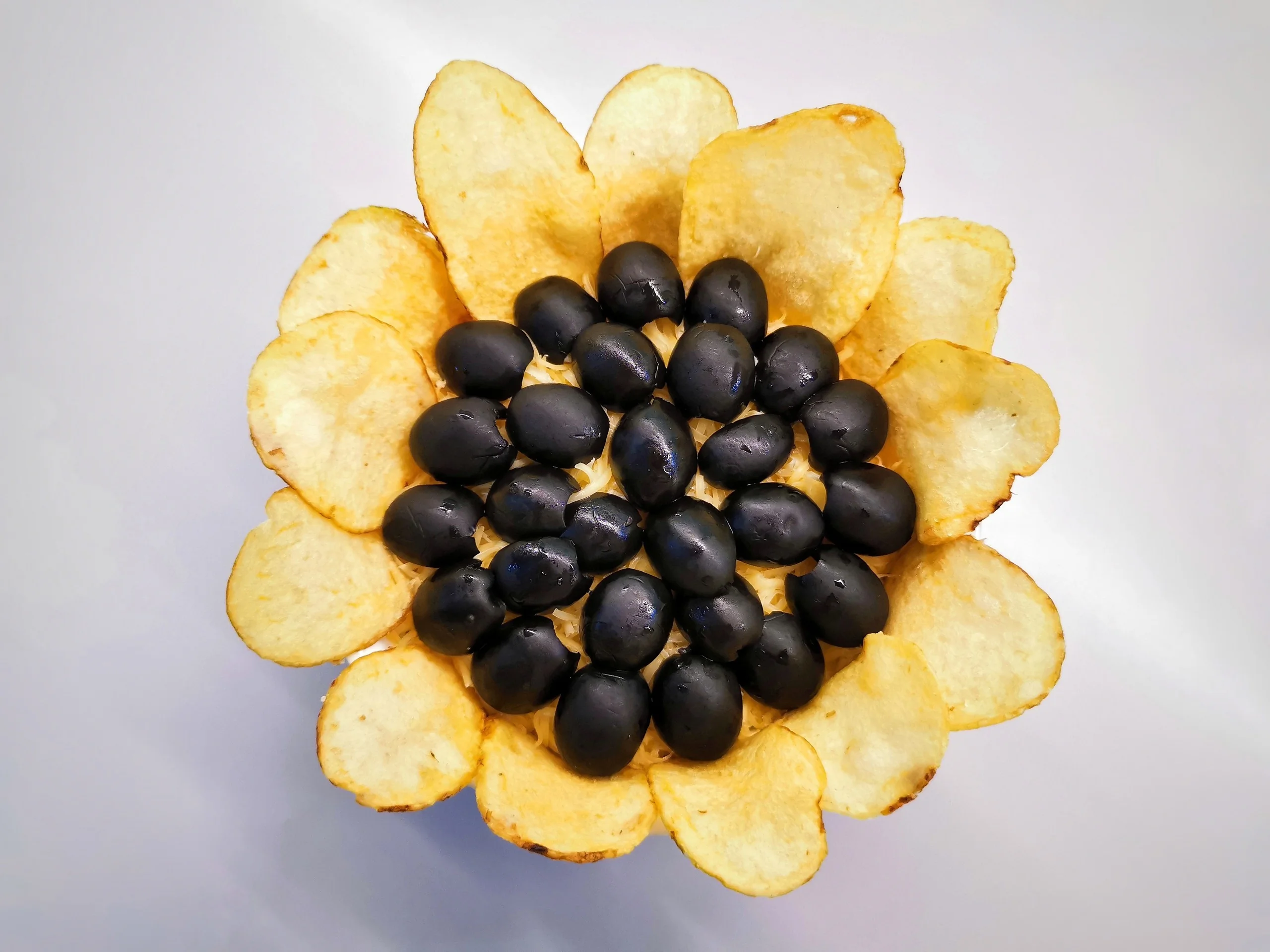 ШАГ 13 Выложить сыр на яйца. По краям украсить чипсами в виде лепестков.