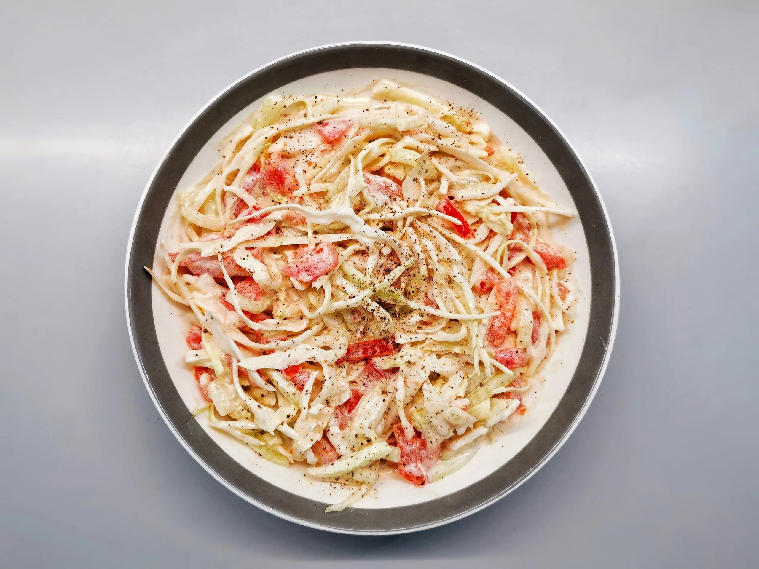 Огурцы Морская соль Молодая капуста Пекинская капуста Помидоры Сметана Майонез Дижонская горчица Белый винный уксус Молотый черный перец Главная Салаты Американская кухня Вегетарианская еда Пошаговые рецепты Овощные салаты Салаты с майонез