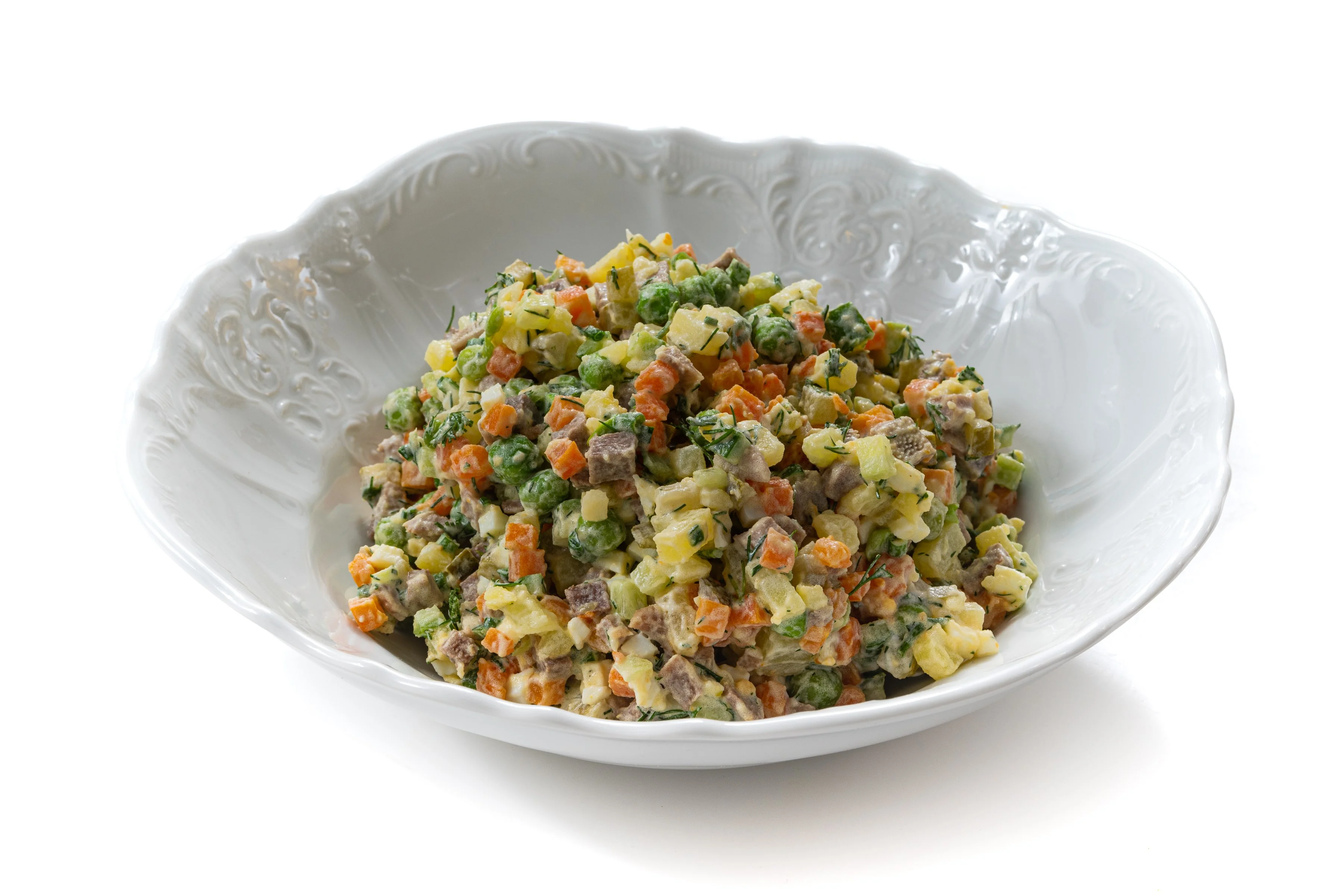 ШАГ 12 Смешать майонез с горчицей и заправить салат этим перед подачей. Посолить и поперчить по вкусу. Подавать оливье, украсив его зеленью.
