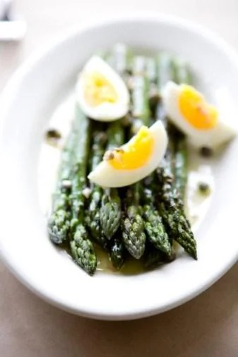 Зеленая спаржа с перепелиными яйцами, сельдереем и эстрагоном