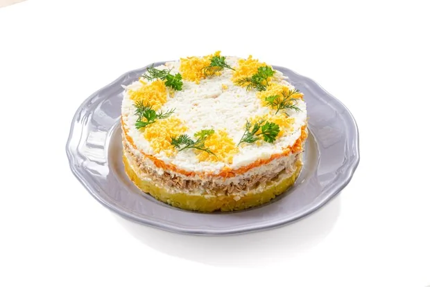 ШАГ 9 Выложить салат на блюдо слоями, промазывая каждый небольшим количеством майонеза, в следующем порядке: картофель, лук, рыба, половина белков, морковь.
