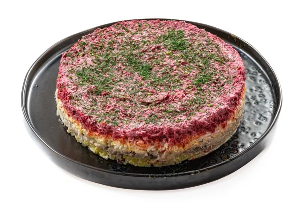 ШАГ 10 Выложить салат на блюдо слоями. Вот рекомендуемый порядок продуктов: картошка, сельдь, яблоки, яйца, морковь. Последним слоем выложить свеклу.