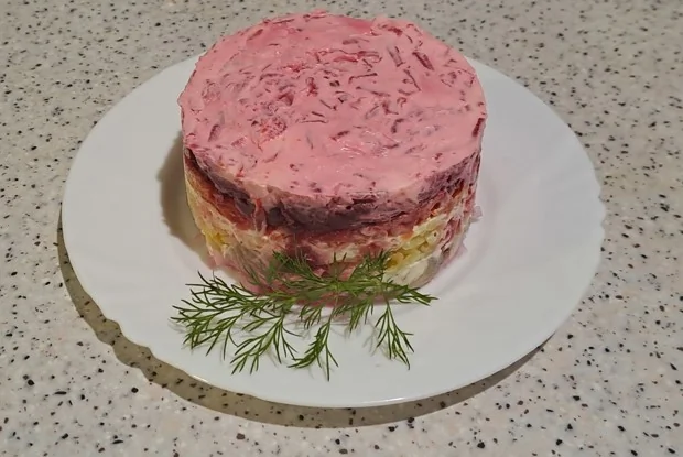 ШАГ 11 По желанию можно предварительно смешать с майонезом в отдельной емкости натертую на крупной терке свеклу и выложить верхним слоем на слой моркови. Дать салату настояться примерно 2–3 часа.