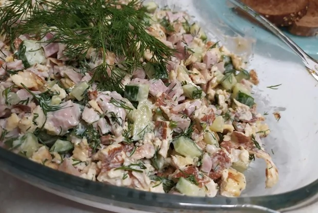 Салат с яичным блинчиком, свежим огурцом и копченым цыпленком