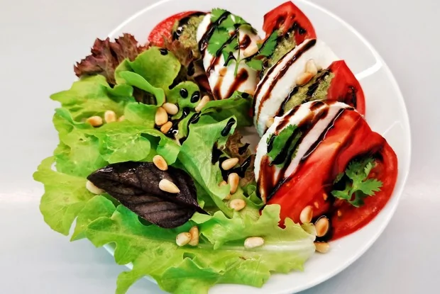 ШАГ 11 Сверху заправить бальзамическим кремом. Украсить листиком базилика.
