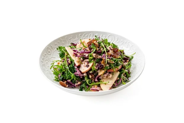 ШАГ 9 Смешать в салатнике отваренную полбу, руколу, яблоки, капусту, финики и орехи. Полить заправкой и перемешать.