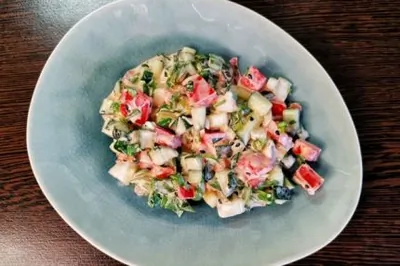 ШАГ 3 Белый стебель салата пак-чой также нарезать кубиками и отправить к огурцам.