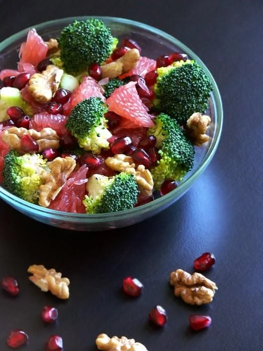 ШАГ 5 Заправить соусом овощи и фрукты и аккуратно перемещать. Сверху украсить остатками зерен граната и грецким орехом.