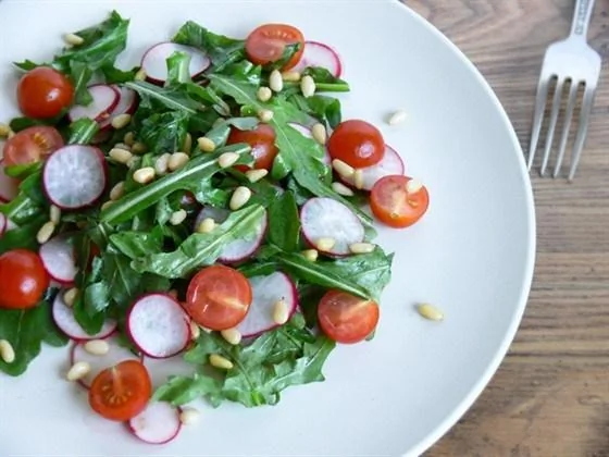 ШАГ 1 Рукколу промыть и порвать руками на части. Редис порезать тонкими кружочками. Помидоры черри разрезать пополам. Добавить кедровые орехи. Заправить все оливковым маслом, лимонным соком, солью и перцем по вкусу.