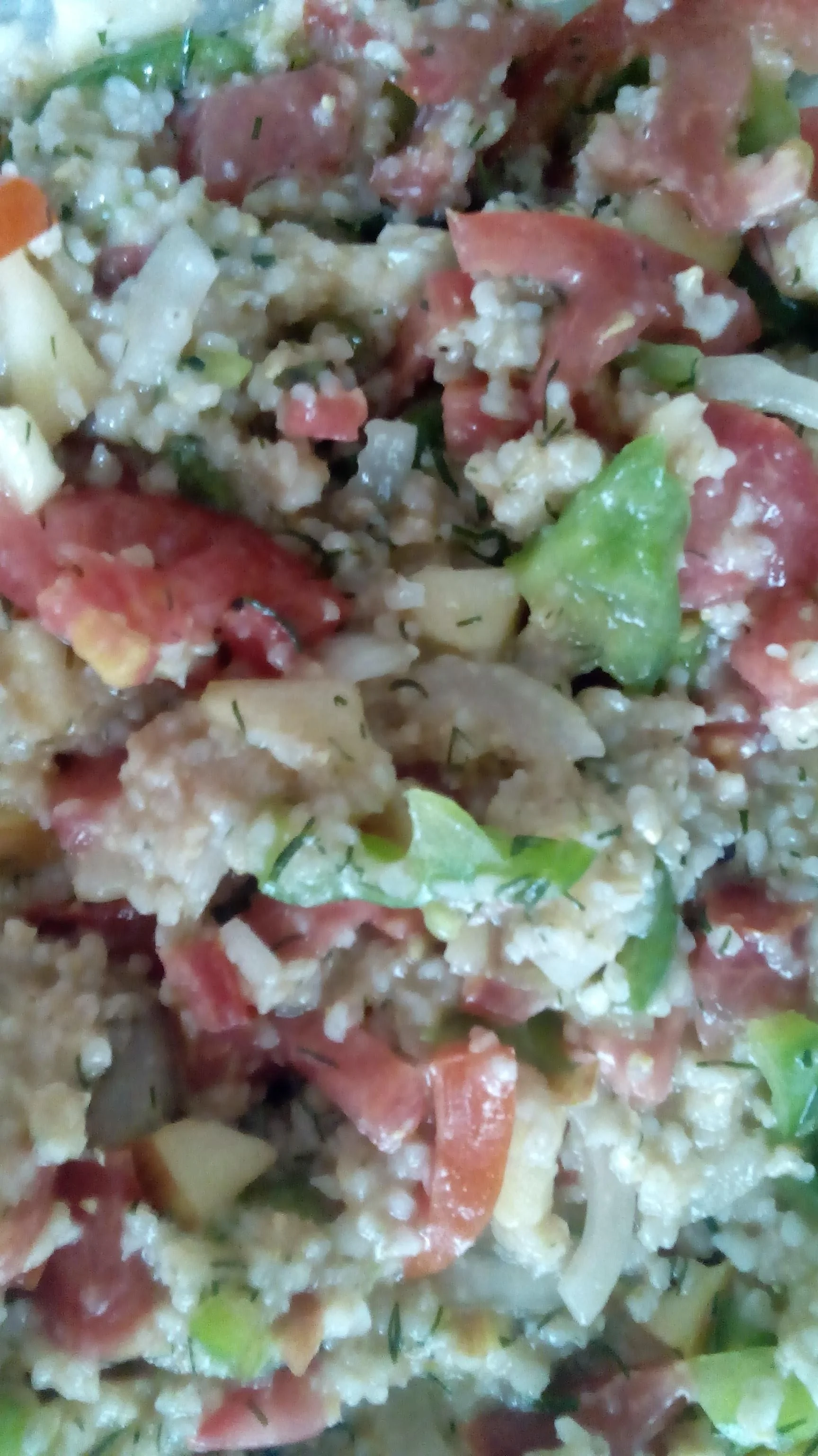 ШАГ 2 Помидоры, перец и яблоко нарежьте и перемешайте с крупой.