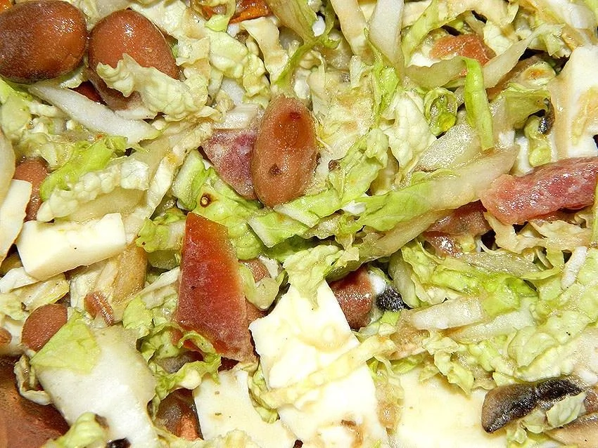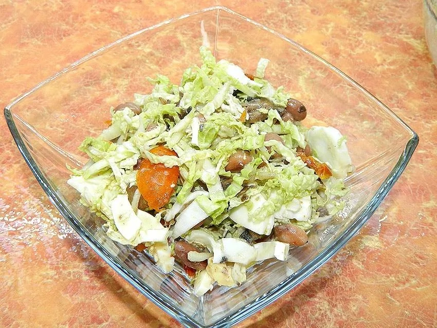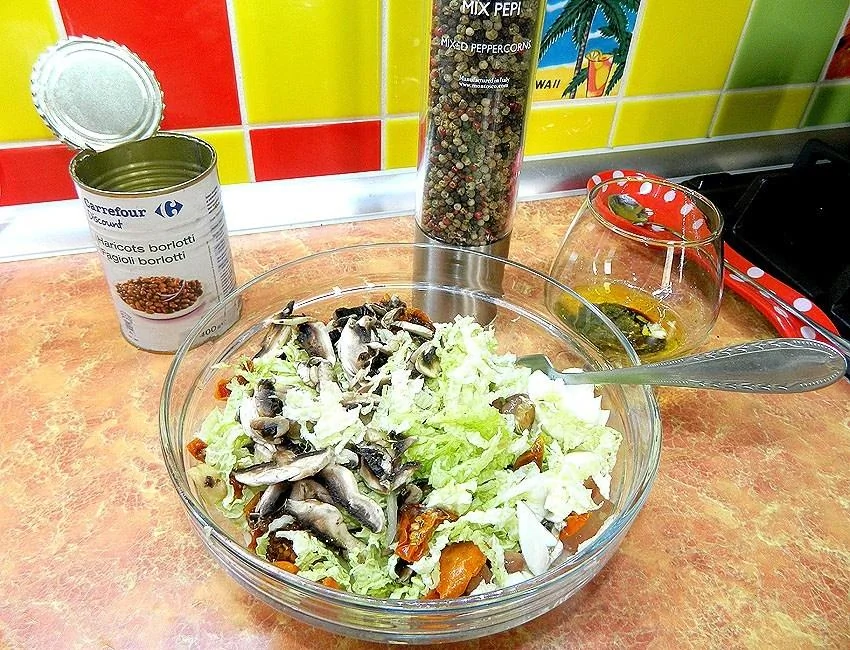 ШАГ 2 В большой миске смешайте фасоль, нарезанную небольшими кусочками ветчину, мелко нарезанный кубиками помидоры, яйца, мелко нарезанный зеленый лук, разорванные на небольшие кусочки листья салата, мелко нарезанный зеленый перец и тонко нарезанные грибы. Сбрызните заправкой и аккуратно перемешайте.