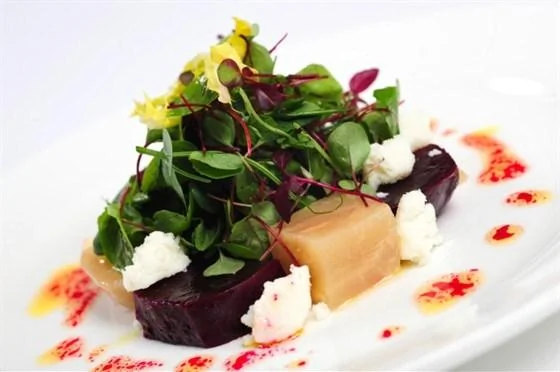 ШАГ 3 Перемешать свеклу и лук. Добавить листья рукколы и козий сыр. Заправьте салат. Для заправки взбейте оливковое масло с бальзамическим уксусом. Добавьте соль, перец.