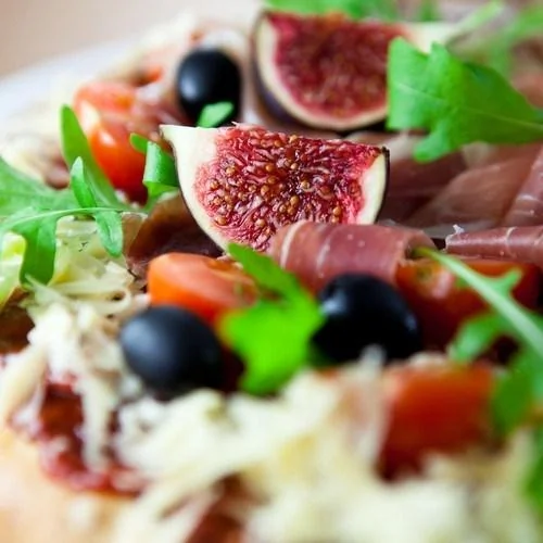 ШАГ 4 Перемешать ветчину и инжир с листьями рукколы. Добавьте лук, нарезанные пополам помидоры и оливки и тертый козий сыр.