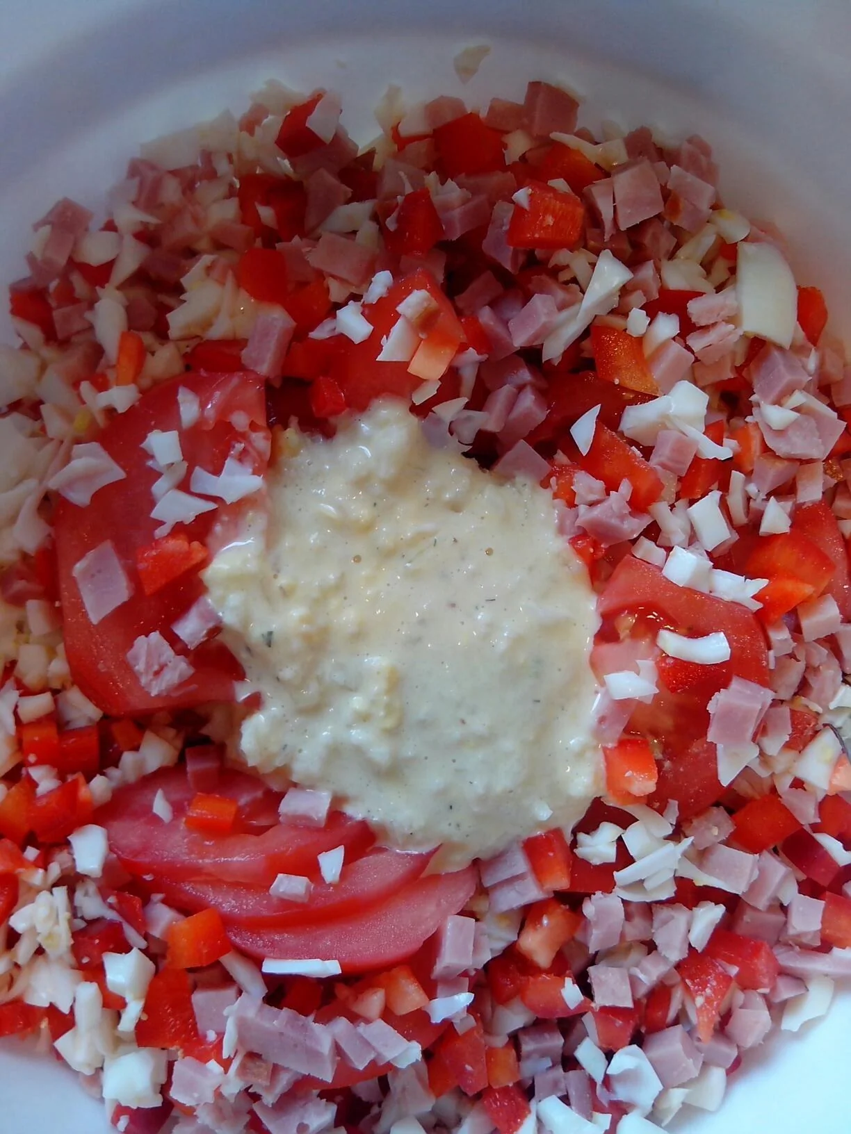 Салат из ветчины, помидоров, зеленого перца и яиц