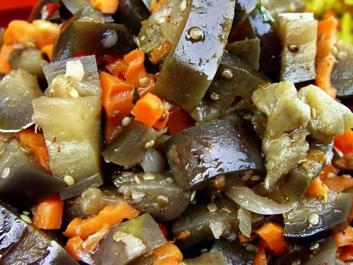 ШАГ 2 Выложите баклажаны м морковь, дайте стечь лишней воде. Заправьте растительным маслом с лимонным соком. Посыпьте тмином.