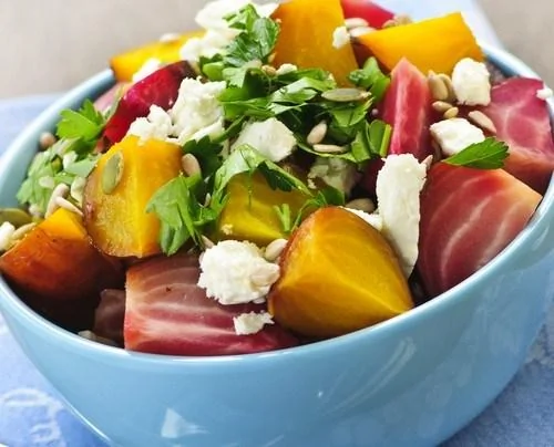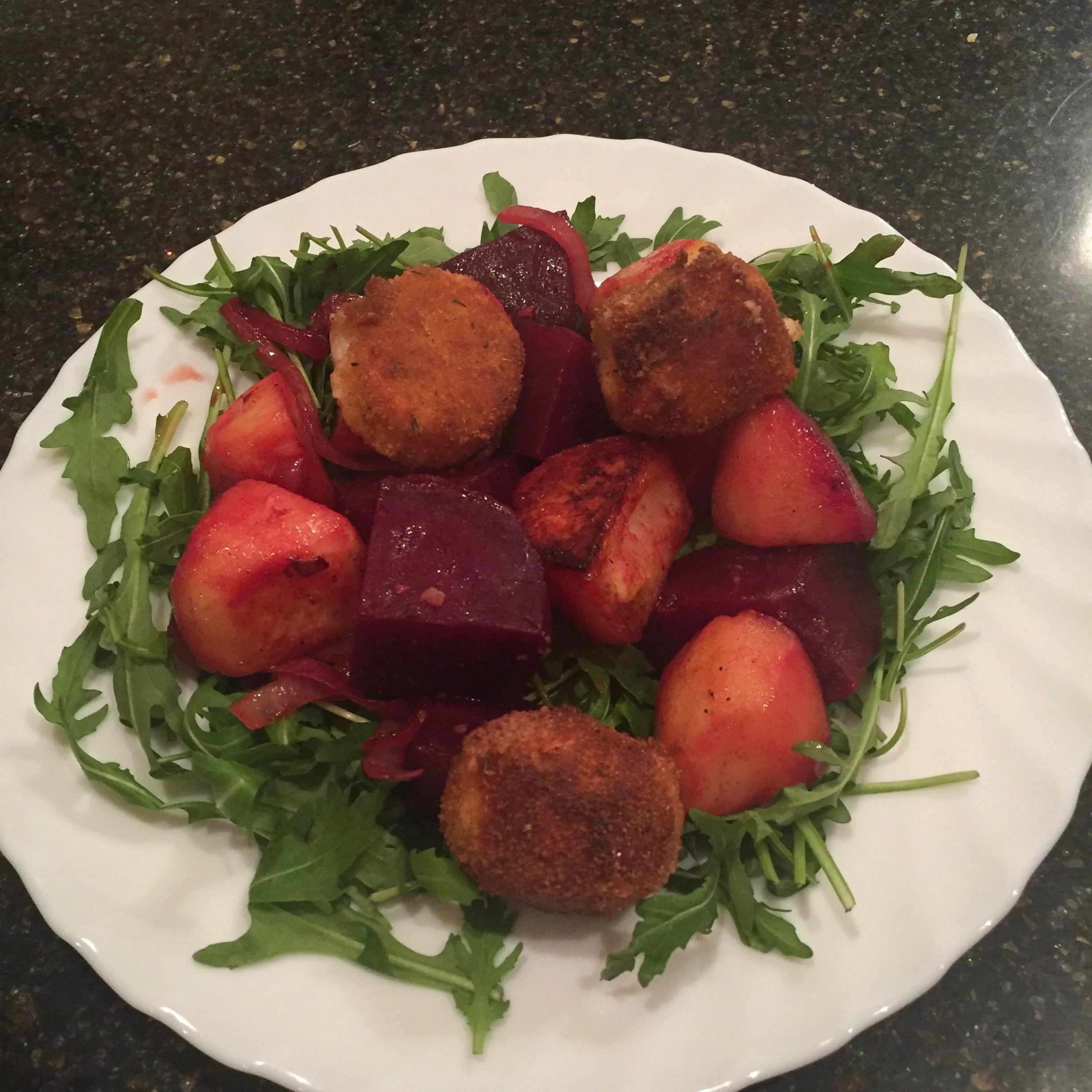 Теплый хрустящий салат с жареной моцареллой, свеклой, молодым картофелем и рукколой
