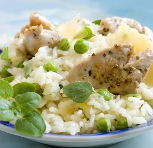 Салат из цыпленка с рисом, зеленым горошком и сладким перцем