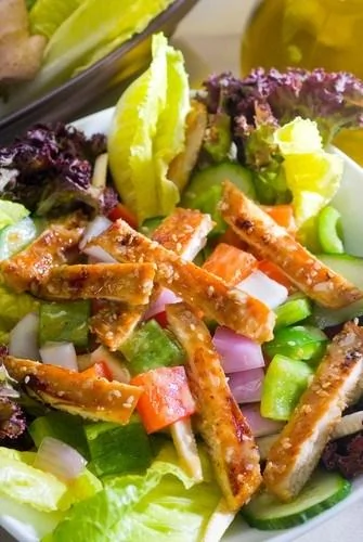 Салат из индейки с луком, перцем и кунжутом под медовым соусом