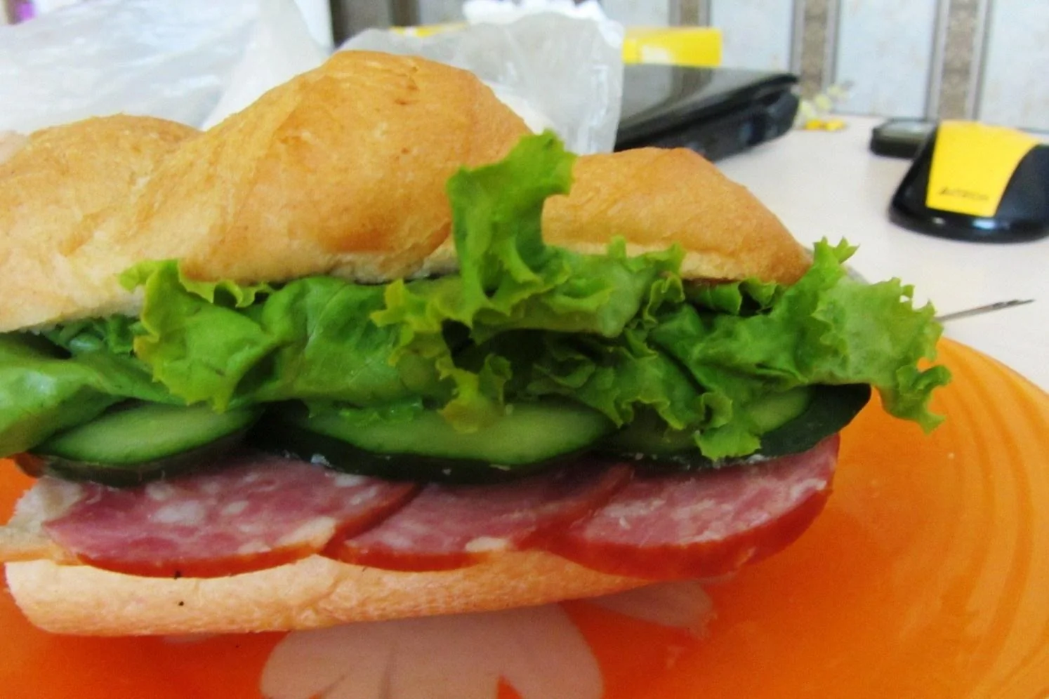 ШАГ 2 Разрежьте багет поперек пополам, затем каждую половину вдоль пополам, не прорезая до конца. Смажьте хлеб с внутренней части горчицей, выложите тонко нарезанное мясо, тонко нарезанную ветчину, тонко нарезанный сыр и тонко нарезанные огурцы. Закройте сэндвичи и смажьте снаружи размягченным сливочным маслом.