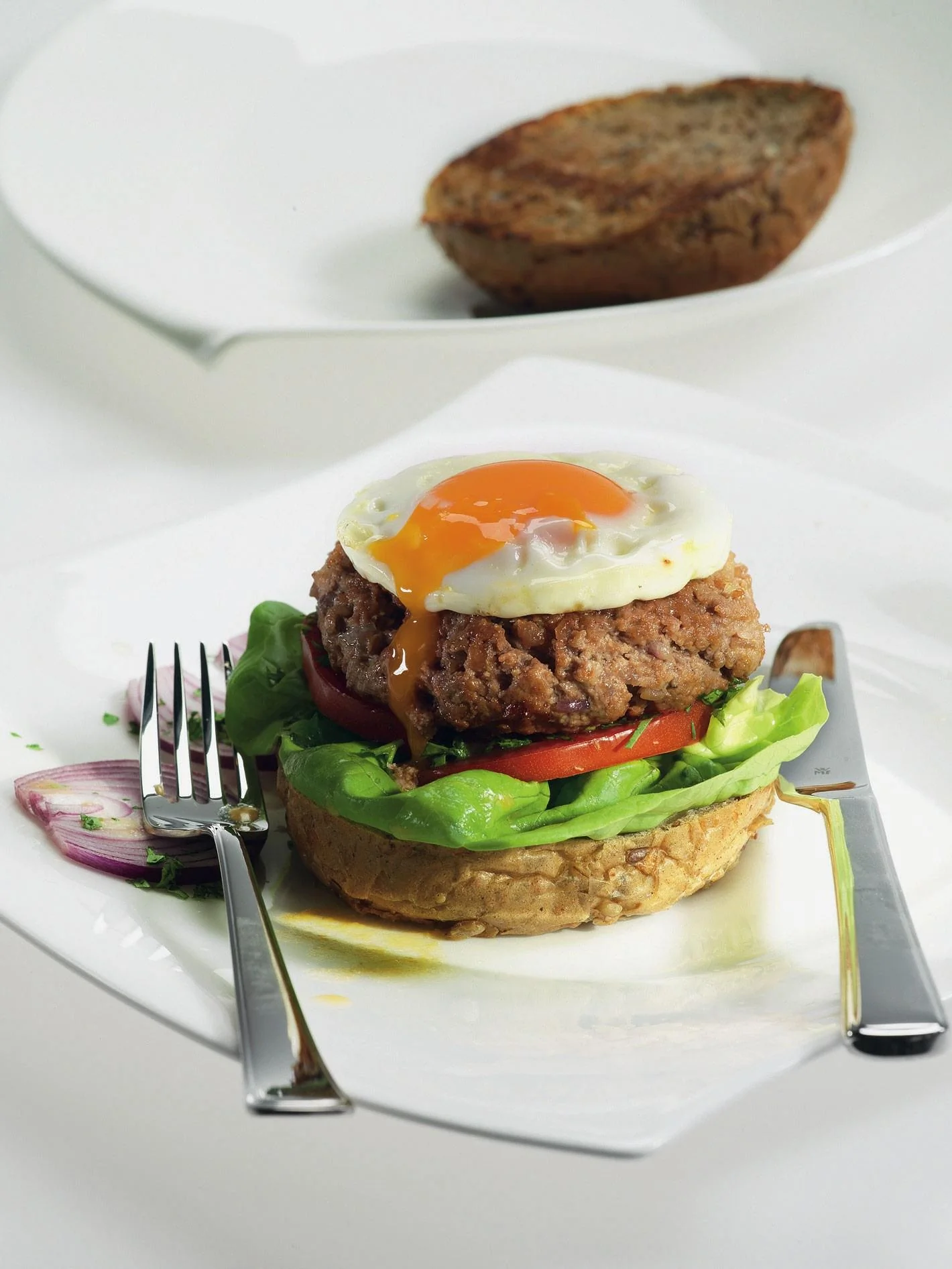 ШАГ 3 Булочку разрезать пополам, обжарить и намазать соусом. Выложить на половину булки лист салата, на него — тонкий ломтик большого помидора, мясо и глазунью. Рядом положить вторую часть булки и тонкие кольца красного лука.