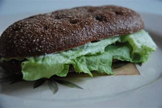 ШАГ 2 Верхний кусочек хлеба намазать сливочным сыром. Положить сверху тонко нарезанный помидор и салатный лист.