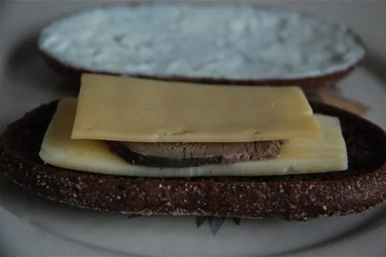 ШАГ 3 На нижний кусочек хлеба положить белый чеддер, затем кусочек печени и сверху сыр эдам.