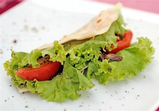 ШАГ 4 Выложить листья салата на питу, сверху положить помидоры, обжаренный лук и бекон.