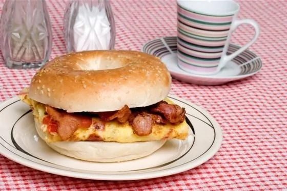 ШАГ 3 Разрезать омлет на 6 порций. Разрезать булочки вдоль. Разложить омлет по половинкам, сверху положить бекон и мелко порезанный печеный красный перец (без семян). Накрыть сэндвичи верхними половинками булочек.