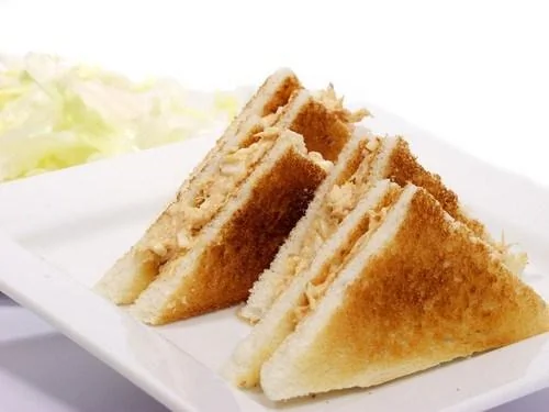 ШАГ 3 На 4 куска выложите салат из лосося, сверху накройте оставшимся хлебом и слегка прижмите.