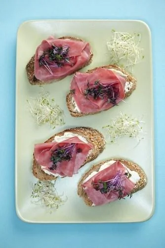 ШАГ 3 На хлеб положить по кусочку ветчины — канапе готово.