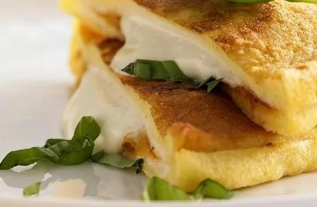 ШАГ 5 Обвалять затем в муке, потом в яйце и отправить на раскаленную сковороду жариться на сильном огне по 1,5 минуты с каждой стороны (одновременно жарить не более двух сэндвичей, чтобы не слиплись). Сразу подавать.