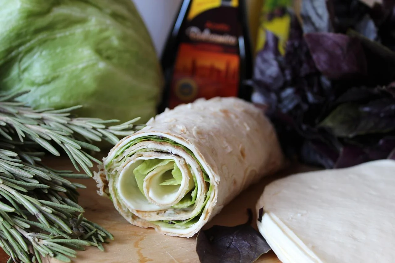 Сыр сулугуни Помидоры Красный базилик Салат айсберг Армянский лаваш Бальзамический уксус Сэндвичи Роллы